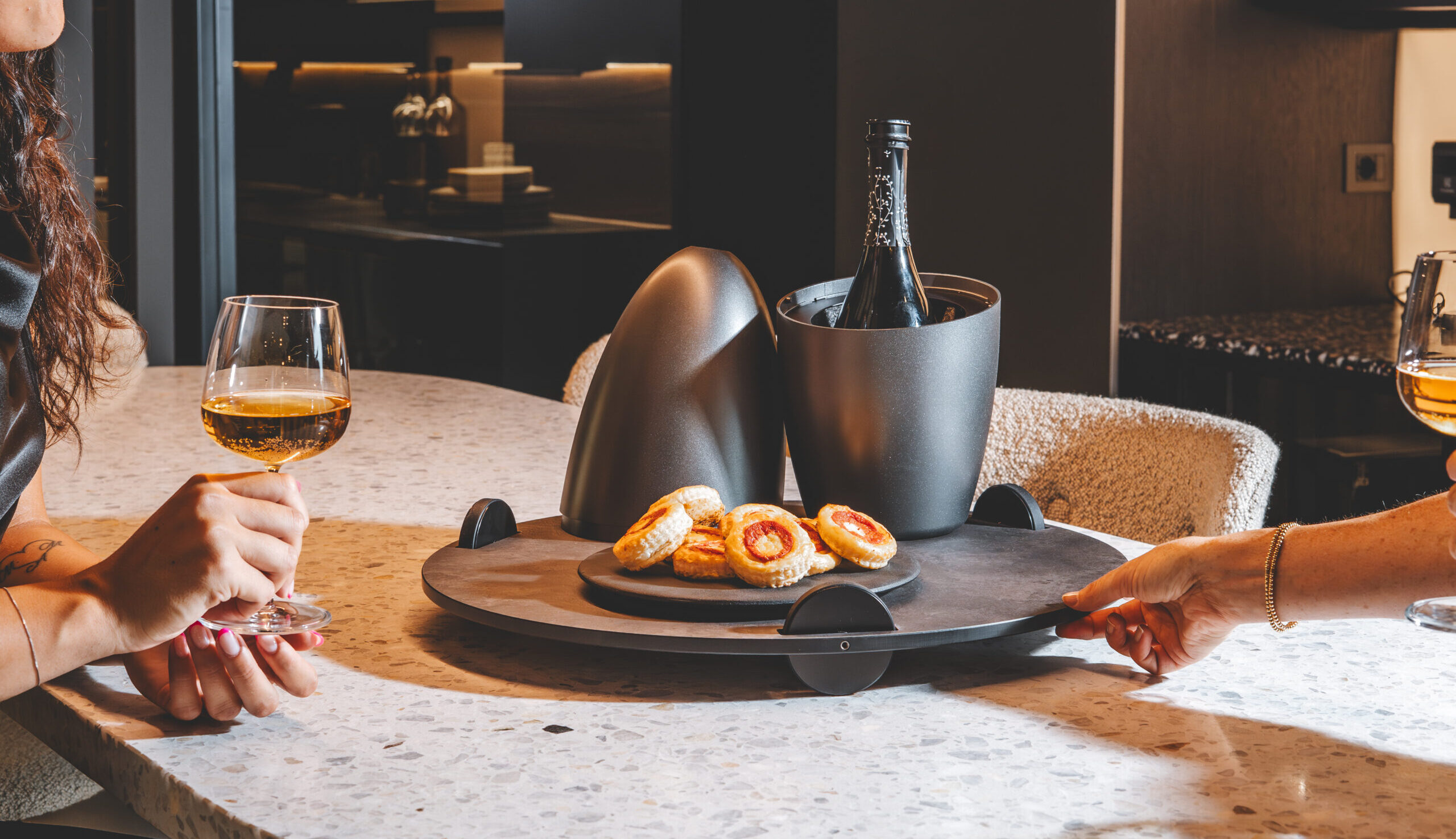 氷や水を使わず、結露を防ぐことで、卓上でのワインサーブをよりスマートに、そしてエレガントに演出します。