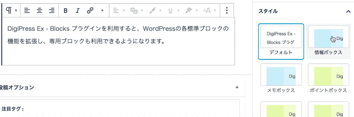 専用プラグイン「DigiPress Ex – BLocks Free」、または「DigiPress Ex – Blocks」とセットで利用すると、WordPress の標準ブロックを大幅に拡張して使い勝手を向上させます。