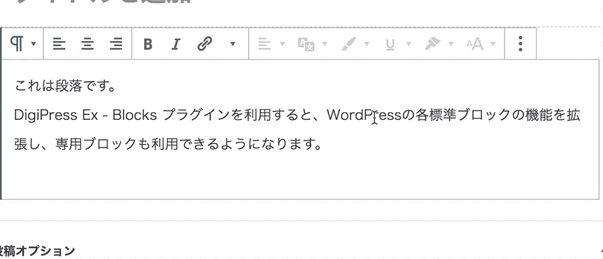 「DigiPress Ex – Blocks」プラグインを利用することで、ブロック内のリッチテキスト部分の編集機能を強化します。