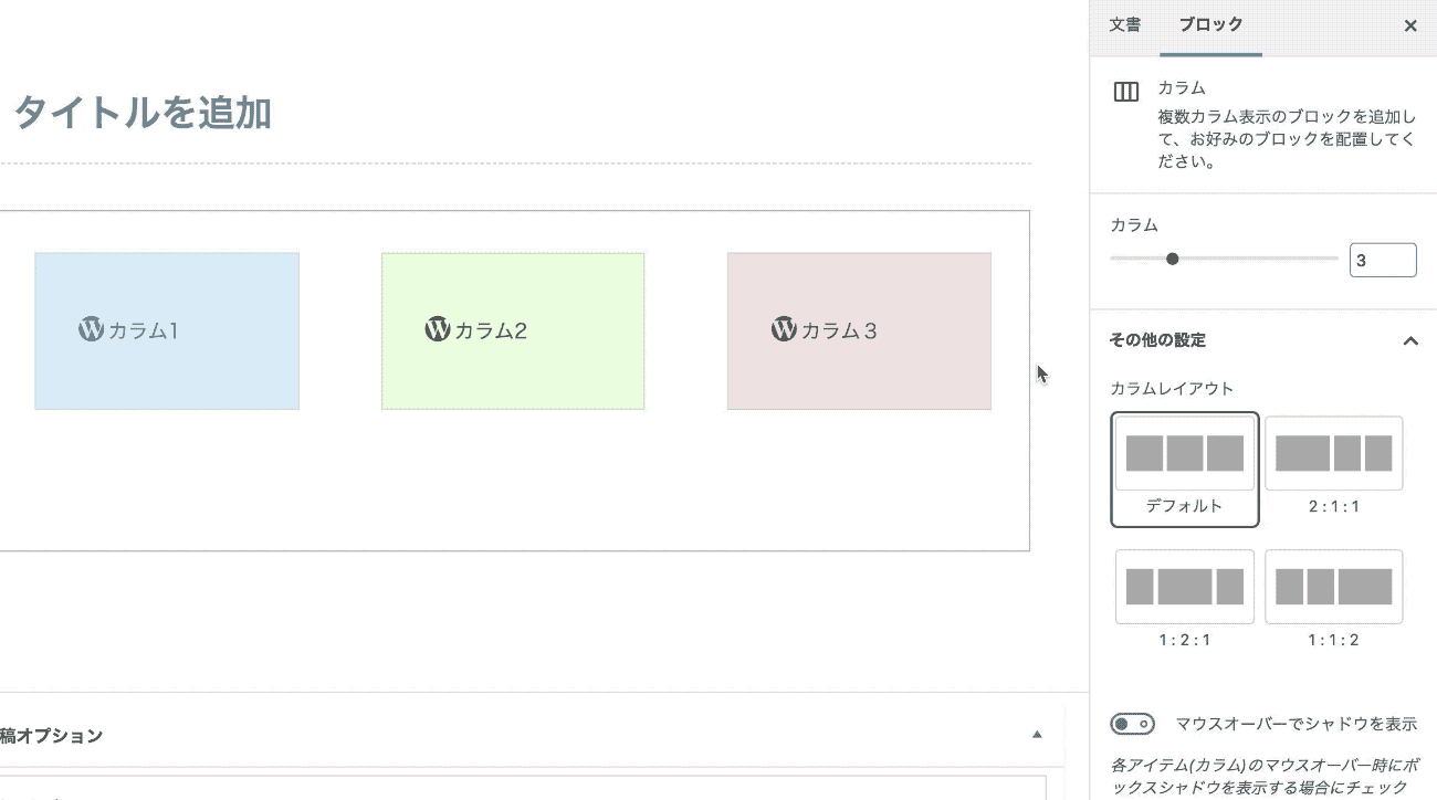 標準の「カラム」ブロックに、等間隔以外のカラム比率を選択する機能や、マウスオーバー時にボックスシャドウを表示するオプションなどが拡張されます。