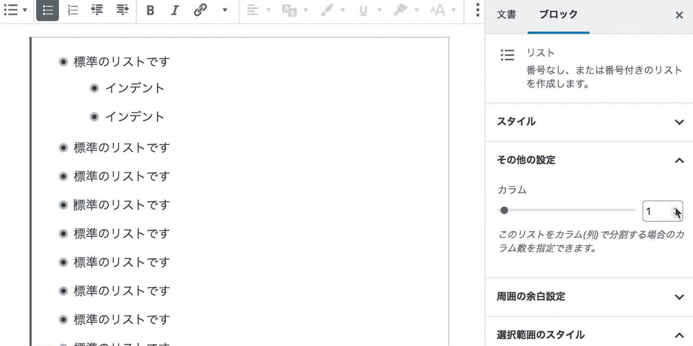 標準の「リスト」ブロックに、3カラムまで自動で分割する機能や各リストに下線を表示する機能などを追加します。