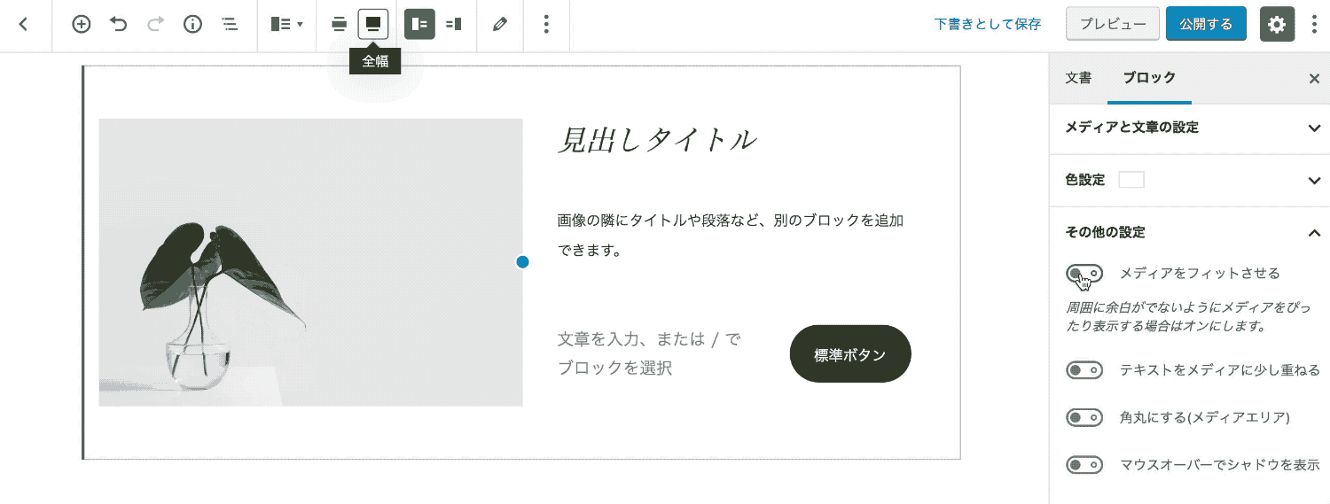 標準の「メディアと文章」ブロックで表示される画像や動画などのメディアを余白なく表示するオプションや、文章エリアをメディアに重ね合わせるデザインにするなどの機能が拡張されます。