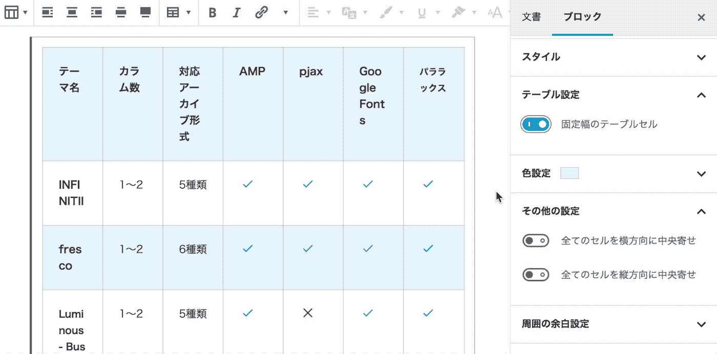標準の「テーブル」ブロックによるHTMLテーブルを、列数が多く横に長い場合は自動的に横スクロール可能にし、様々なデザインスタイルやセルにアイコンを表示できる機能などを拡張します。